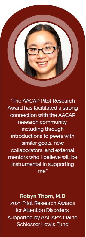 • AACAP Pilot Research Award for Attention Disorders, supported by AACAP's Elaine Schlosser Lewis Fund
